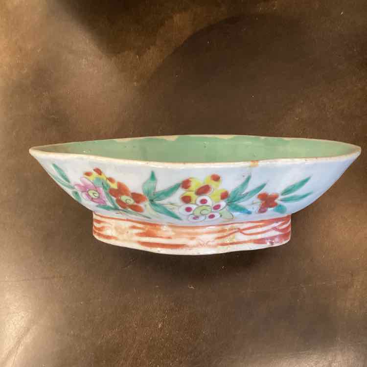 7" x 2" Decorative Dish, Off White with Rust, Pink Flowers, Green Leaves