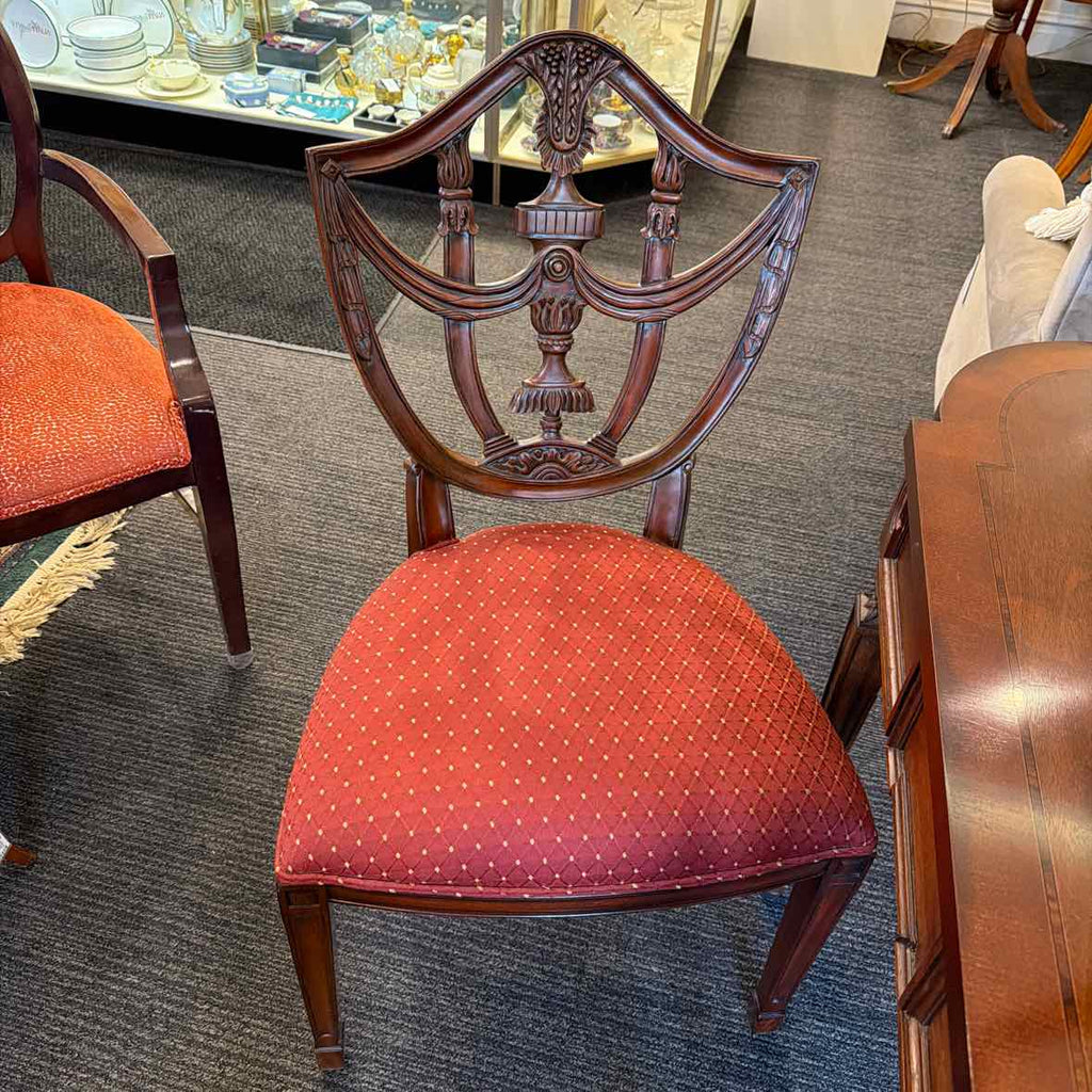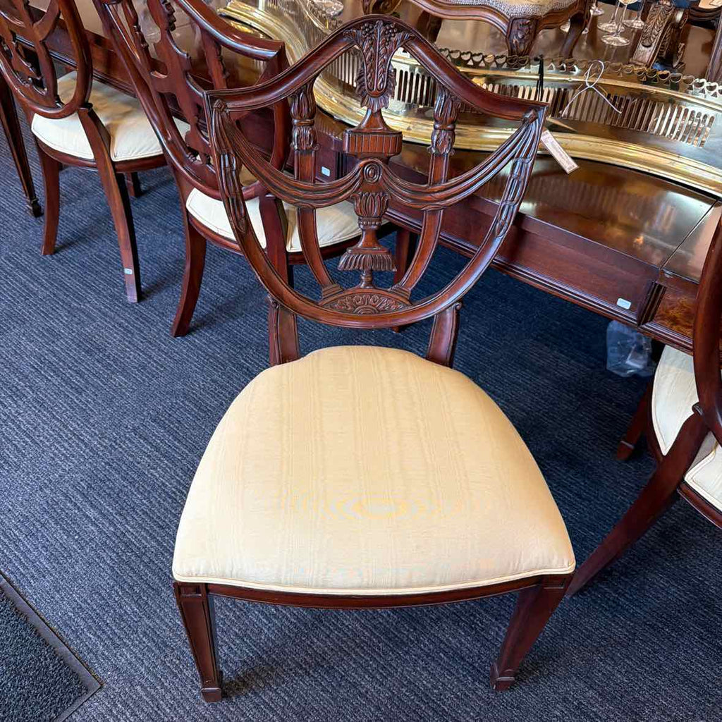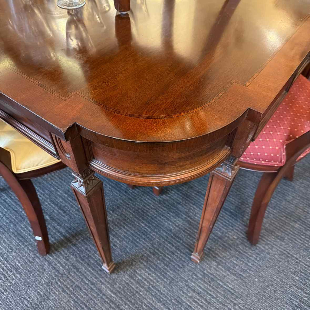 Maitland Smith Banded Mahogany Dining Table with 2 24" Leaves, 2 Arm Chairs (Wheat), 8 Side Chairs (Wheat), 2 side chairs (Red)